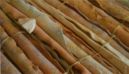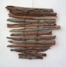 Al enige jaren [maakt Gertrude wandobjecten die ze Khanda's noemt. Het zijn rolletjes klei. ieder met zijn eigen vorm. die samen een eenheid zijn. In de klei zijn structuren gemaakt. die lijken op de huid van een slang of een vis of soms op boomschors. Ze gebruikt verschillende soorten klei, maakt dunne. dikke. korte-re of langere rolletjes en geeft ze verschillen-de structuren en kleuren. waardoor de objecten wel hetzelfde lijken. maar toch telkens net iets anders zijn. Daardoor roept elke Khanda een ander gevoel op.