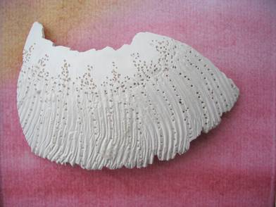 De collages zijn opgebouwd uit verschillende materialen. Porcelein en Franse grès gecombineerd met elementen uit de natuur. Door een sluierverf techniek als achtergrond toe te passen wordt het tot een eenheid gesmeed.